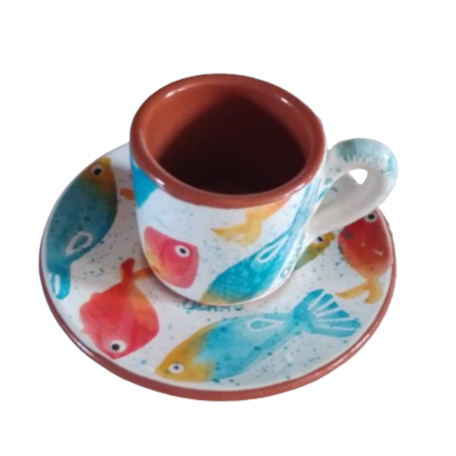 Chávena de café com bordo em cerâmica pintada à mão decoração peixinhos (52), poderá selecionar apenas a chávena e/ou o pires, selecionar o pretendido na opção de escolha abaixo: