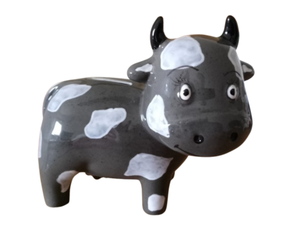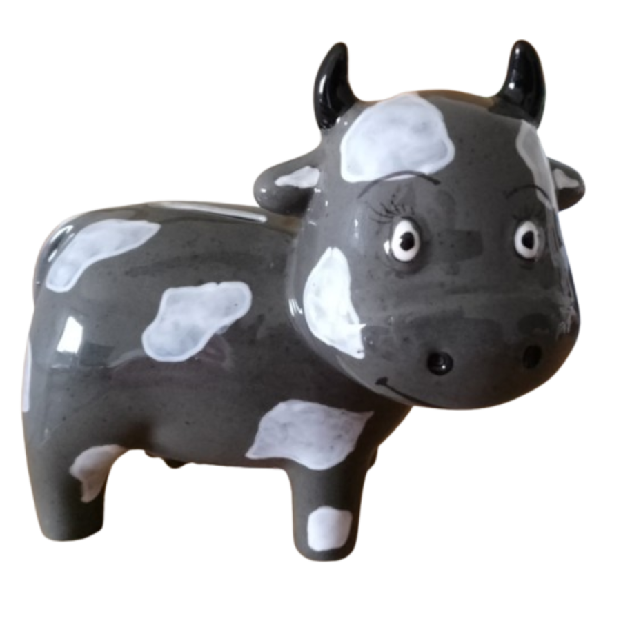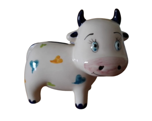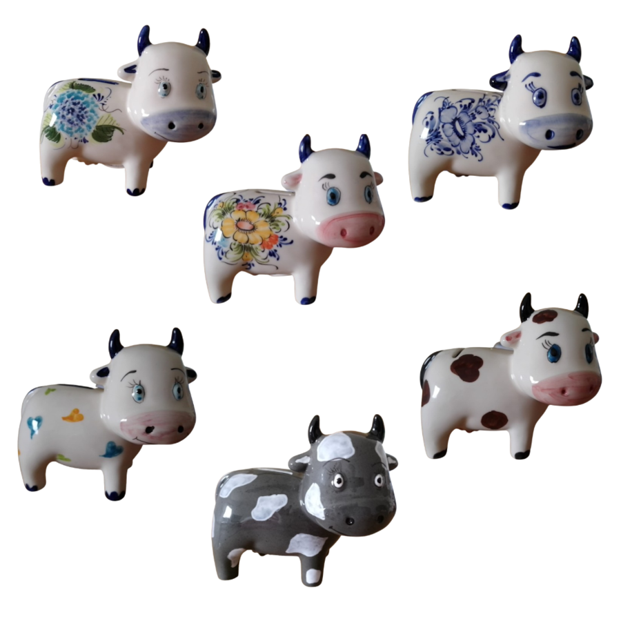 Vaquinha mealheiro em cerâmica pintada à mão, disponível em várias decorações, selecione o pretendido: